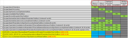 Go back and look at the matrix. Look at the inconsistency in the terminology the US GAAP XBRL Taxonomy uses. There is zero reason for this sort of inconsistency. For example, while reporting entities might refer to something as "nature of business" or "nature of operations" or "business description" or "organization" or perhaps a handful of other terms; the US GAAP XBRL Taxonomy really should be using exactly ONE term. I happened to pick "Nature of business". The US GAAP XBRL Taxonomy could pick some other term. Does not matter what term. But they should pick it and stick with that term consistently. This may seem like a very simple thing, and it is pretty basic. But you would be surprised of how much of this sort of inconsistency exists in the US GAAP XBRL Taxonomy and the problems that the inconsistency causes in terms of concept duplication, difficulty in using the taxonomy, general confusion, complexity, and so forth.