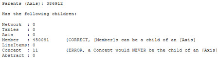 The point here is that an [Axis] has Members, which is defined as a report element with a type attribute equal to 'nonnum:domainItemType', as children, nothing else. What does it mean if a Concept is a child of a Member? Concepts are used to report facts. Members are used to describe the value of an Axis. Concepts are not intended as children of an Axis. So, how should this be interpreted?