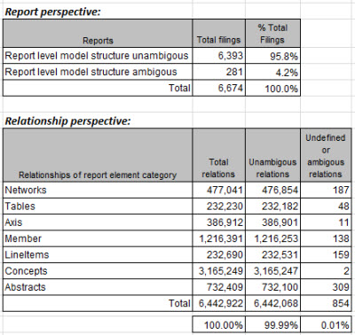One mistake I was making which came to light is that I was evaluating filing rather than actual relations. This is important because while the data shows that 95.8% of SEC XBRL financial filings had unambiguous relations (i.e. if only ONE relation was ambiguous, the ENTIRE REPORT was said to be in error); if you looked at the RELATION LEVEL, 99.9% of the millions of relations were unambiguous.