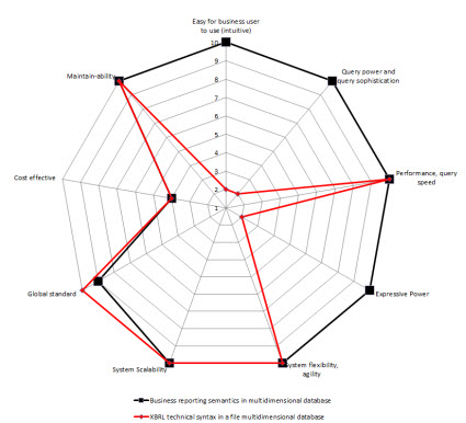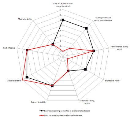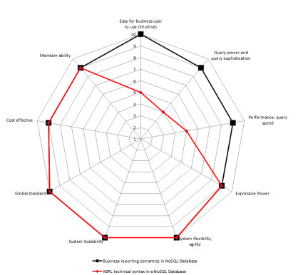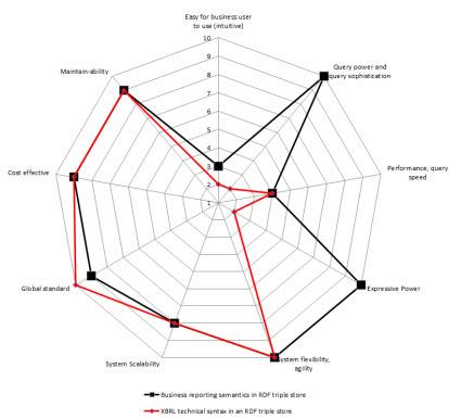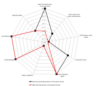 So, I created radar charts for each of the options for implementation from above. On the chart I show two sets of data: one for storing the XBRL technical syntax (in RED), the other for storing a more business semantics oriented format (in BLACK). I assigned values for each of the 9 constraints. The radar graphs below show the results that I get: