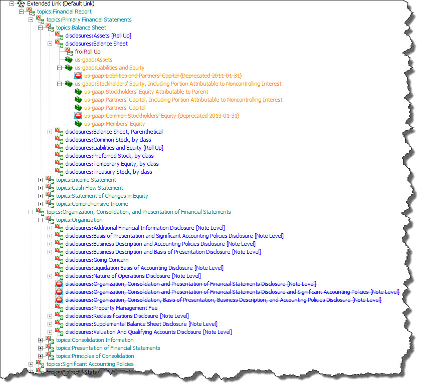 - You don't want your company to use the concepts us-gaap:OrganizationConsolidationAndPresentationOfFinancialStatementsDisclosure, us-gaap:OrganizationConsolidationAndPresentationOfFinancialStatementsDisclosureAndSignificantAccountingPolicies, us-gaap:OrganizationConsolidationBasisOfPresentationBusinessDescriptionAndAccountingPoliciesDisclosure because you would prefer your organization to break each disclosure into the individual pieces, rather than pack several disclosures together.