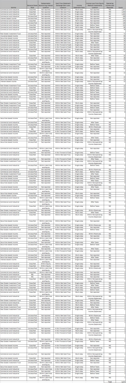 Below is a screen shot of some quick and dirty queries that I created to try and understand the way public companies report. This may not make total sense or it may not be interesting for your analysis purposes, but it is useful for what I am working on. Click on the image to check it out. Or, grab this ZIP file which has an Excel spreadsheet with the information. I even created a handy pivot table you can play with.