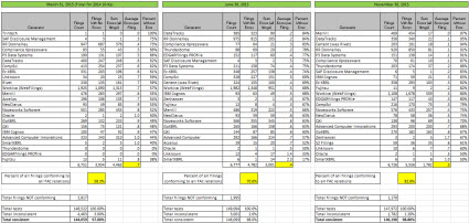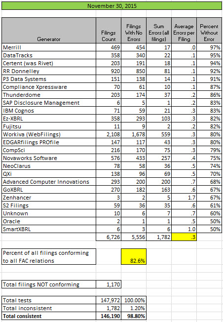 The column "Percent Without Error" in the table below indicates the percentage of a generaor's (software vendor or filing agent) filings which are completely consistent with expectations represented by the set of approximately 22 relations. For example, the first generator in the list "Merrill" created 469 XBRL-based financial filings which were submitted to the SEC, 454 of those contained no inconsistencies, and therefore 97% of the filings they created were completely consistent with what is expected by the 22 consistency tests.