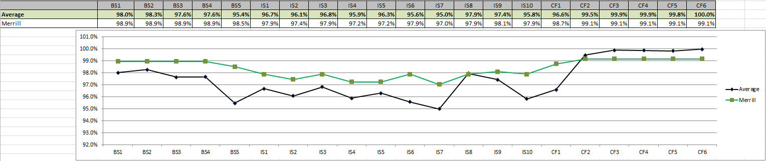 Average consistency with each basic, common sense fundamental accounting concept relation and comparison of software vendor/filing agent with average: (Shows Merrill as compared to average)