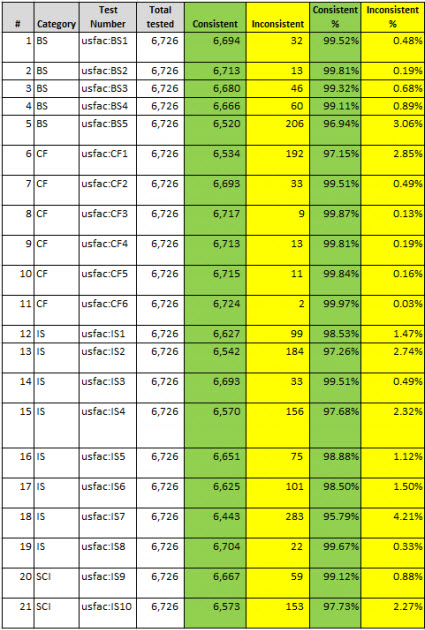 For more information or to obtain a complete set of test results, please contact me. The documents Arriving at 2014 Digital Financial Reporting All Stars: Summary and Understanding Minimum Processing Steps for Effective Use Of SEC XBRL Financial Filing Information, provides helpful information if you want to better understand the tests and testing process.