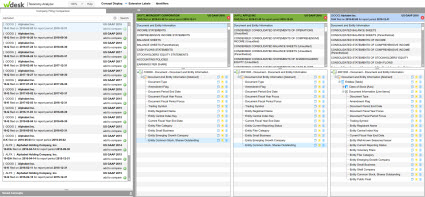 The first tool is the Workiva Taxonomy Analyzer Classicversion. This lets you look at the XBRL taxonomies of I believe any XBRL-based report submitted to the SEC by a public company. What is really useful about this tool is that you can compare the taxonomies of two, three, or even more companies. Here is a screen shot: