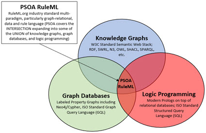In a RuleML technical memo; Graph-Relational Data, Ontology, Rules; Harold Boley points out that there tends to be three general paradigms for problem solving using machines: knowledge graphs, graph databases, and logic programing. In that paper he provided a graphic that showed the intersections of these three paradigms.