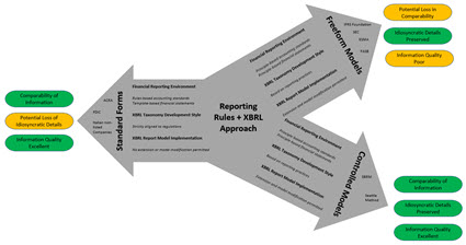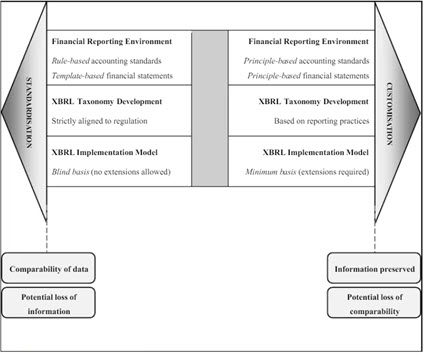 I ran across a very good academic paper that was published in 2013. The title of the paper is Critical Reflection on XBRL: A “Customisable Standard” for Financial Reporting? In the paper they compare two approaches for creating XBRL taxonomies and reports and they provide the following graphic from page 126 of that paper. They call the approaches "Standardization" which means a forms-based implementation with no extensions allowed and "Customization" which means extensions are allowed. Then at the bottom they provide information about the resulting ability to consume reported information and the idiosyncratic details provided within the report.