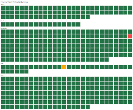 First, I have pointed out before that an XBRL-based digital financial report is a finite, discrete set of statement. This graphic shows this visually; each GREEN square represents a discrete statement that is verified to be correct, each ORANGE square represents a discrete statement that is worth looking at in more detail, and each RED is an error: (click the image for a prototype HTML page)