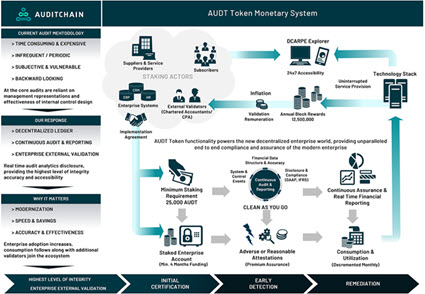 Auditchain is a decentralized accounting, reporting, audit, and analysis ecosystem that enables control, reliability, trust, and therefore effective automation of tasks and processes. Auditchain is a mechanism that can be leveraged to implement modern accounting processes.